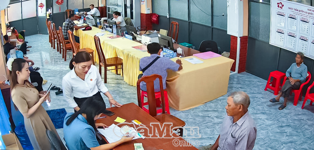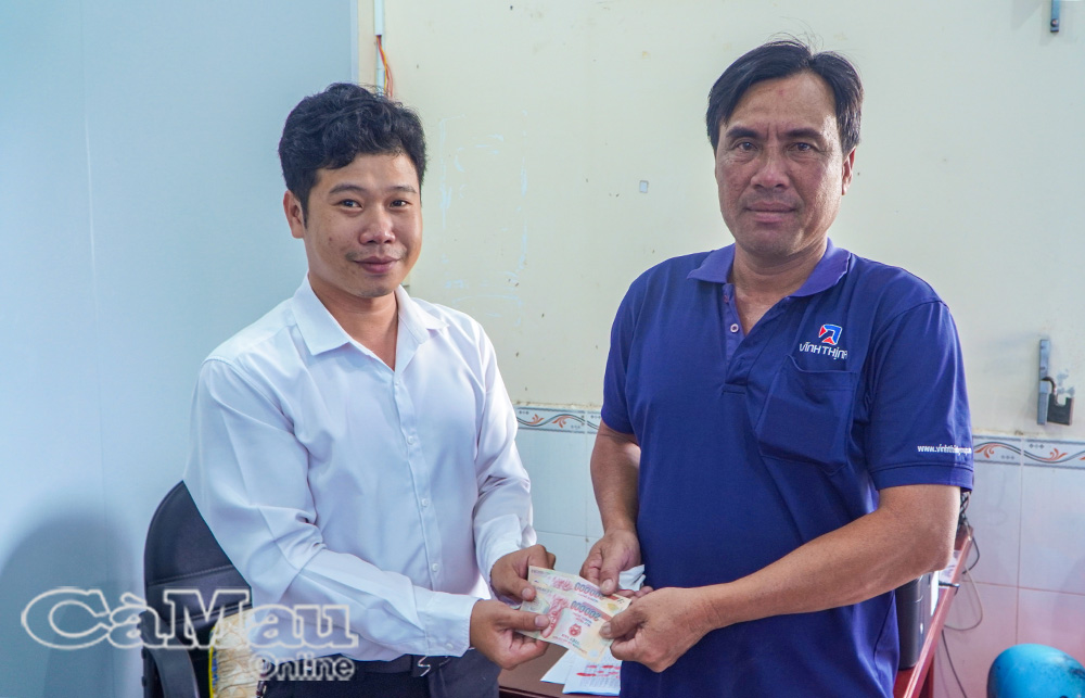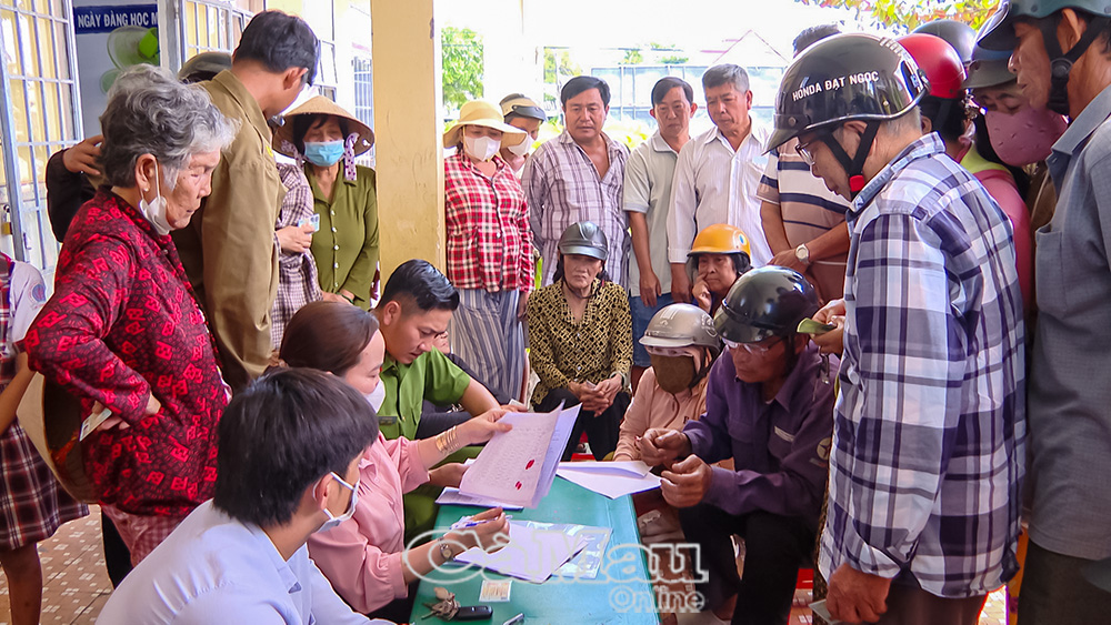 Cán bộ Phòng Văn hoá - Xã hội xã Năm Căn chi tiền quà cho các đối tượng.