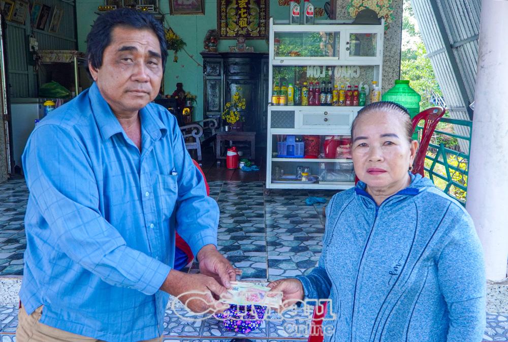 Ông Trần Công Văn, ấp Hóc Năng, xã Tân Ân (bên phải; thuộc đối tượng bảo trợ xã hội), nhận 400 ngàn đồng tiền quà của Đảng và Nhà nước.
