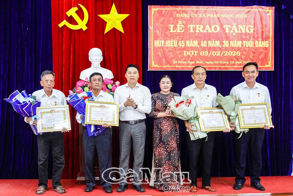 *Đợt này, xã Phan Ngọc Hiển có 4 đảng viên được trao Huy hiệu Đảng, gồm: Lê Việt Khởi (45 năm tuổi Đảng); Đặng Thanh Hùng (40 năm tuổi Đảng), cùng sinh hoạt tại Chi bộ ấp Nhưng Miên; Trần Hoàng Lạc (30 năm tuổi Đảng), Chi bộ ấp Tam Hiệp và Hồ Sỹ Hưng (30 năm tuổi Đảng), Chi bộ Trường THCS Bông Văn Dĩa. Các đồng chí đều là những đảng viên tiêu biểu, luôn giữ vững bản lĩnh chính trị, gương mẫu trong công tác và phong trào tại địa phương.