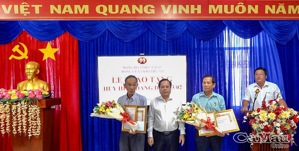Đồng chí Phan Hoàng Vũ, Phó Chủ tịch HĐND tỉnh Cà Mau trao Huy hiệu 40 năm tuổi Đảng cho đảng viên Phạm Văn Sáu.