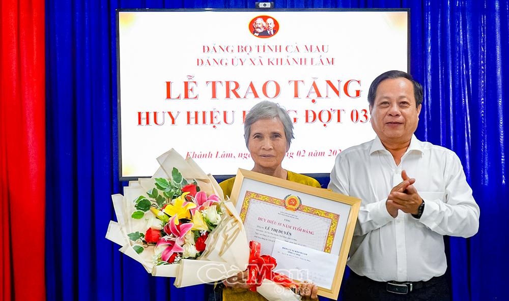 Đồng chí Huỳnh Minh Nguyên, Bí thư Đảng uỷ, Chủ tịch HĐND xã Khánh Lâm trao Huy hiệu 55 năm tuổi Đảng cho đồng chí Lê Thị Duyên, Chi bộ Ấp 10.