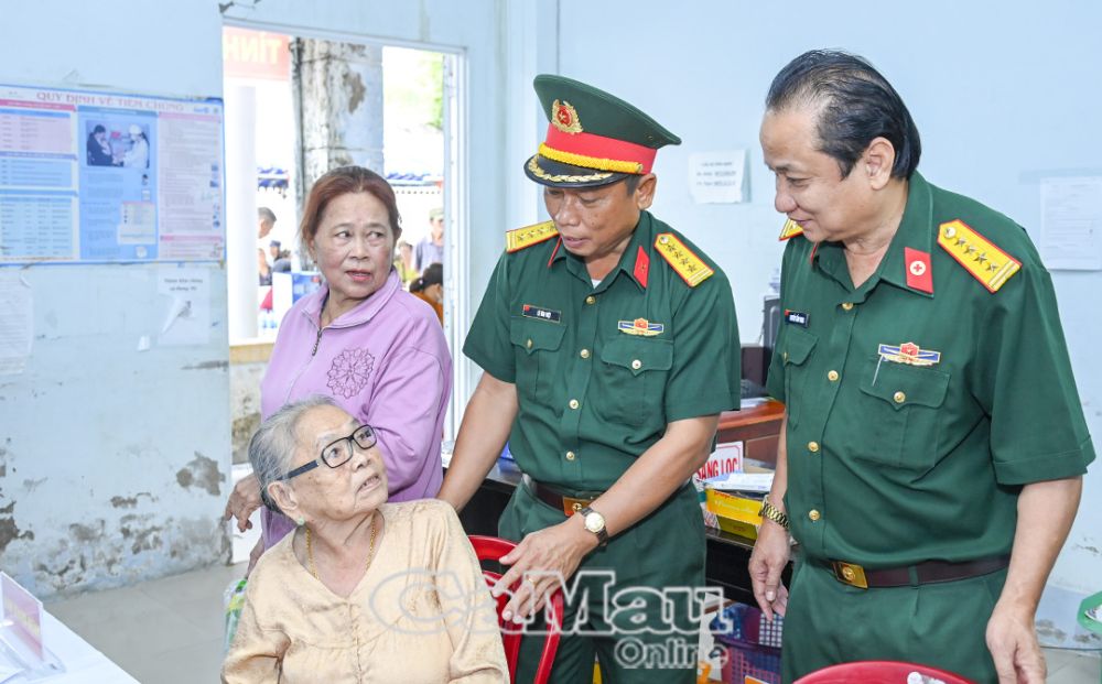 Đại tá Lê Văn Việt, Phó Chủ nhiệm Chính trị Quân khu 9 (thứ hai từ phải sang), thăm hỏi người dân đến khám sức khoẻ.