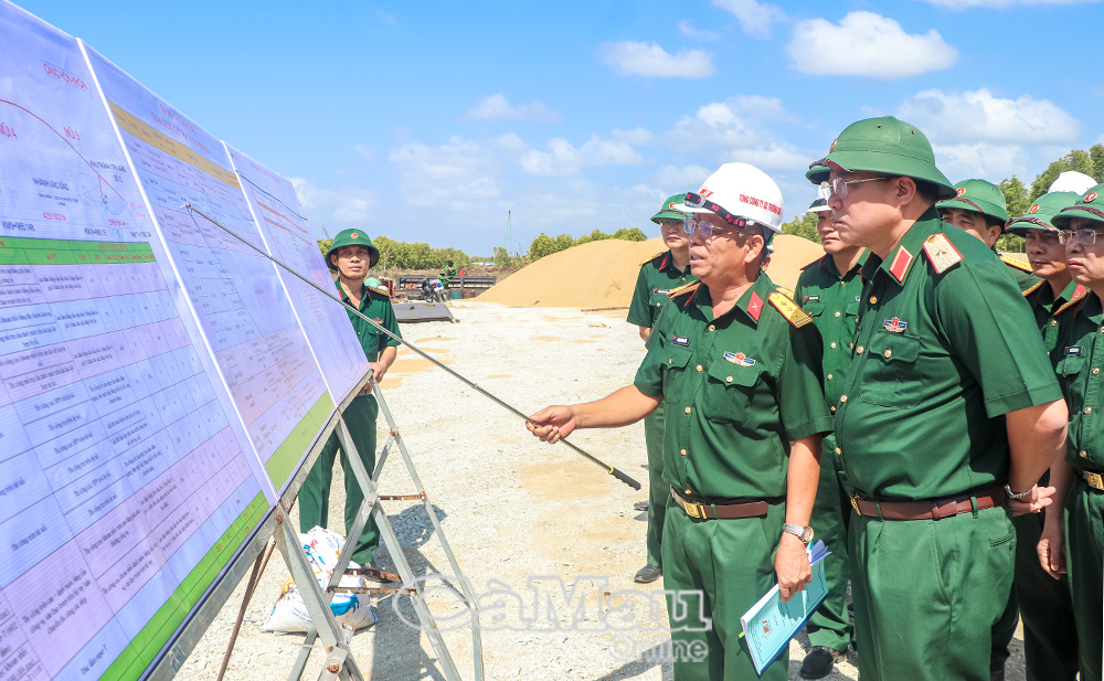 Đại diện nhà thầu báo cáo tiến độ thi công các dự án với Thiếu tướng Nguyễn Hữu Ngọc, Tư lệnh Binh đoàn 12 (Bộ Quốc phòng) tại chuyến khảo sát Dự án Cái Nước - Đất Mũi, ngày 14/3.
