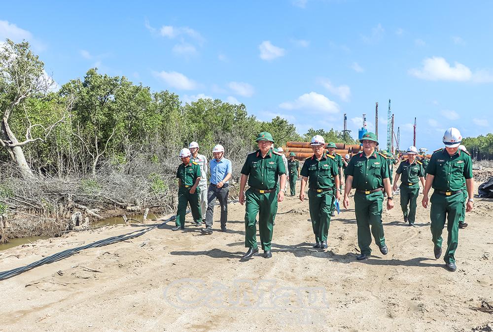 Thiếu tướng Nguyễn Hữu Ngọc (hàng trước, bên trái), Tư lệnh Binh đoàn 12 (Bộ Quốc phòng) khảo sát Dự án Cái Nước - Đất Mũi, ngày 14/3.