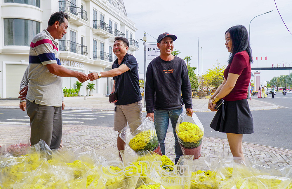 Từ ngày 21 tháng Chạp, ông Trần Văn Việt (bìa trái), phường Sa Đéc, tỉnh Đồng Tháp, chở xuống Cà Mau 1.500 chậu cúc Hà Lan, cúc Hàn Quốc, cúc họa mi và cây tắc. Có đêm ông bán hơn 200 chậu, vượt mong đợi. Phấn khởi trước sức mua tăng, 28 Tết ông báo tin sẽ về nhà sớm hơn dự tính để đón xuân cùng gia đình.