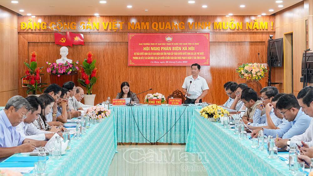 Sáng 26/8, Ban Thường trực Uỷ ban MTTQ Việt Nam tỉnh Cà Mau tổ chức Hội nghị phản biện xã hội đối với dự thảo Quyết định của UBND tỉnh về phân cấp thẩm quyền xác lập và phê duyệt phương án xử lý tài sản được xác lập quyền sở hữu toàn dân trên địa bàn tỉnh.