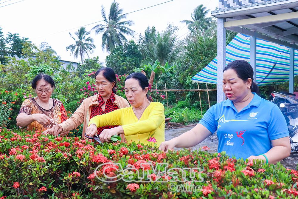 Bà Sử Thị Hồng Sương, Khóm 29, phường An Xuyên (thứ hai từ phải sang) cắt tỉa hàng rào cây xanh của gia đình, góp phần xây dựng tuyến đường xanh, sạch, đẹp chào mừng cuộc bầu cử.