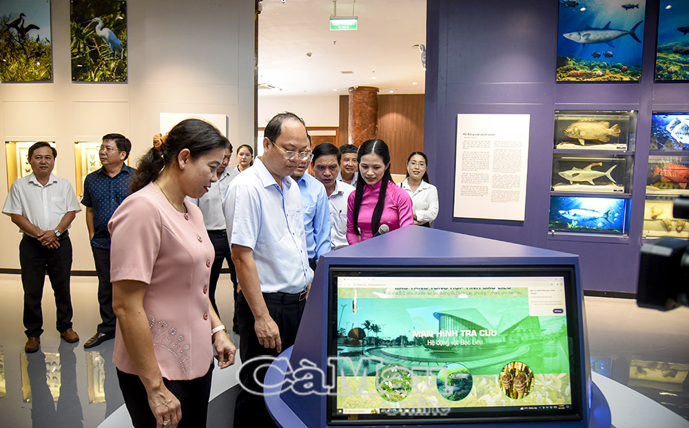 Bí thư Tỉnh uỷ Nguyễn Hồ Hải trải nghiệm màn hình tương tác ứng dụng số hoá tại Bảo tàng tổng hợp tỉnh Cà Mau khu vực Bạc Liêu.