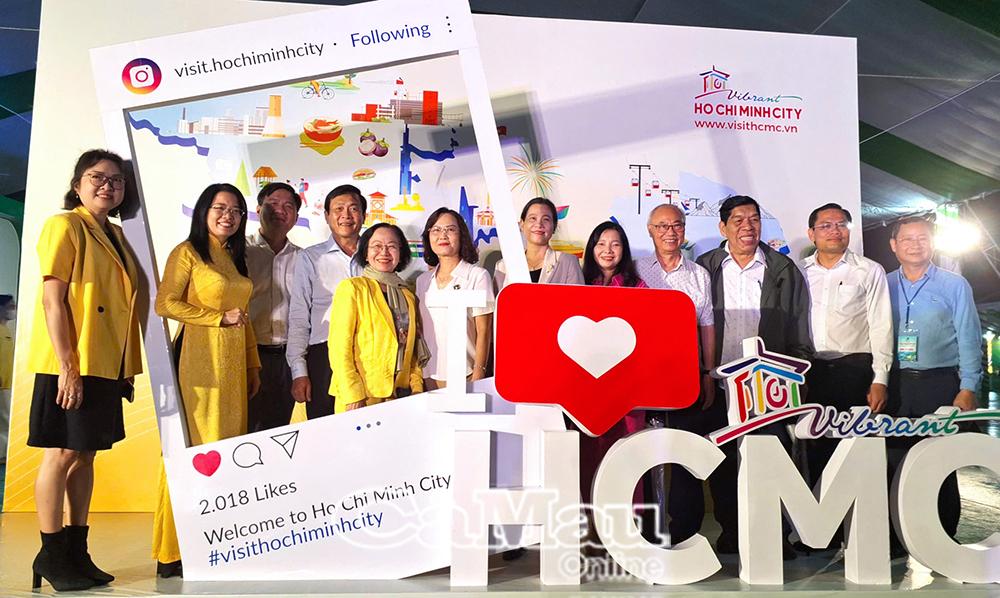 Lãnh đạo tỉnh và các đại biểu check-in tại khu trưng bày các sản phẩm du lịch đặc trưng của TP Hồ Chí Minh.