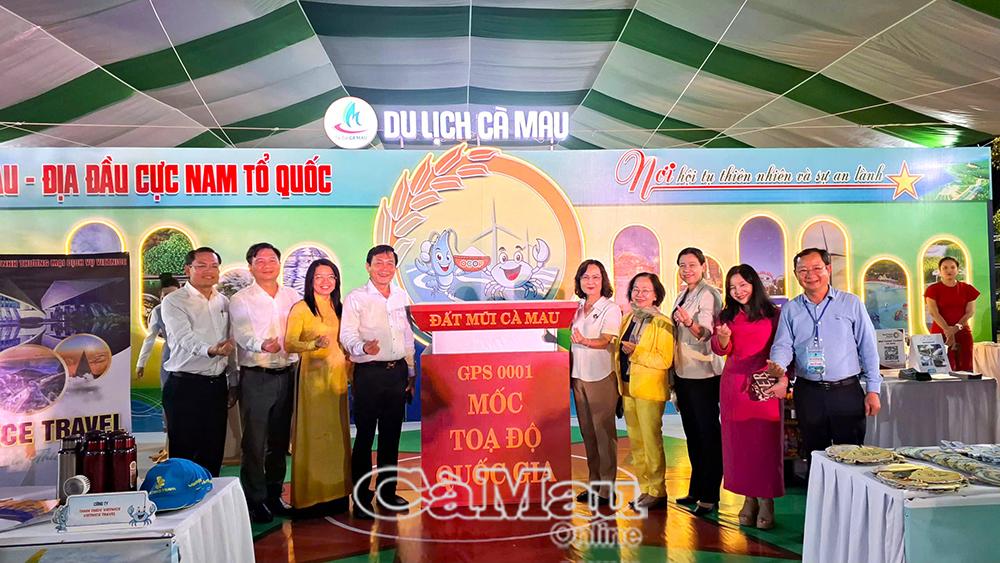 Lãnh đạo tỉnh và các đại biểu check-in tại khu trưng bày các sản phẩm du lịch đặc trưng của tỉnh Cà Mau.