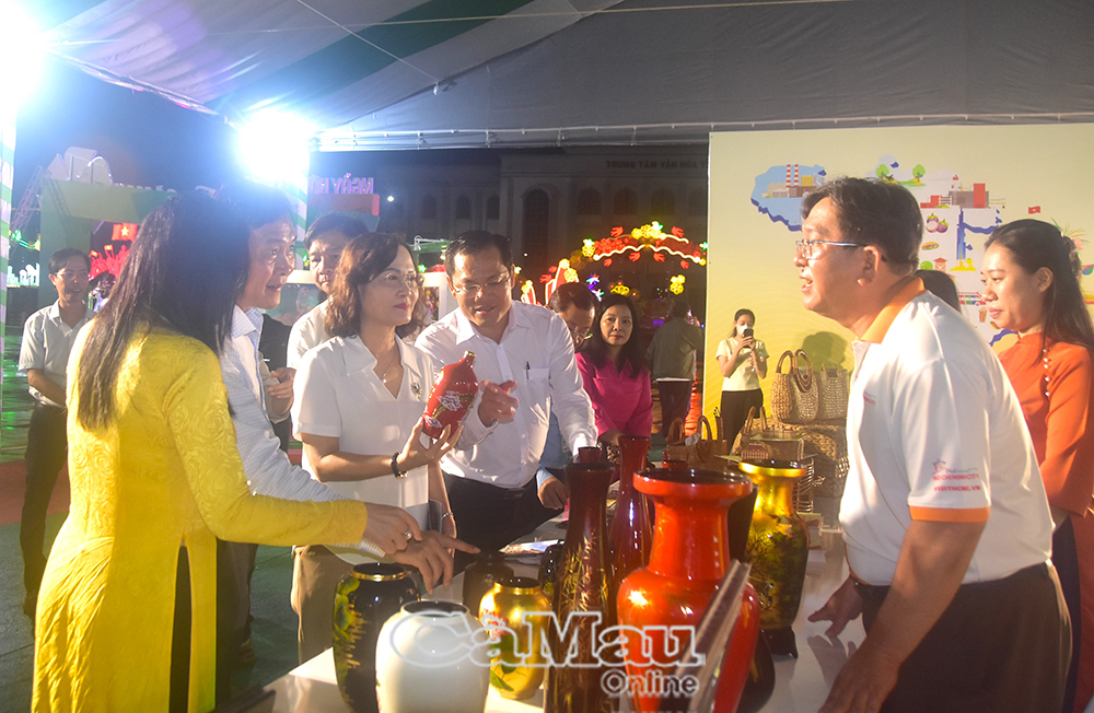 Lãnh đạo tỉnh cùng các đại biểu tham quan gian hàng trưng bày sản phẩm thủ công mỹ nghệ của TP Hồ Chí Minh.