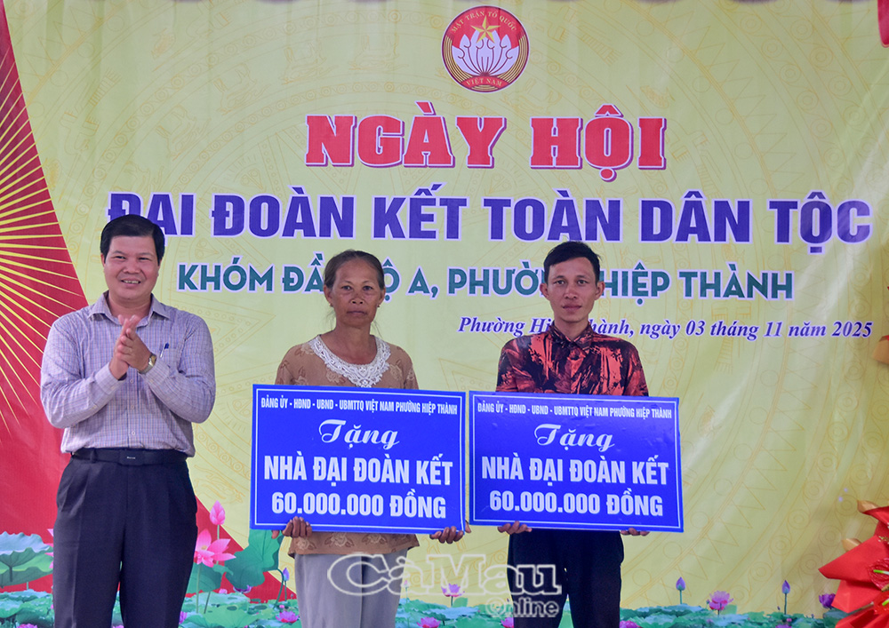 Bí thư Đảng uỷ phường Hiệp Thành Trần Minh Hải trao hỗ trợ 2 căn nhà Đại đoàn kết cho hộ bà Sơn Thị Bó (khóm Giồng Giữa A) và hộ ông Võ Đại Nhân (khóm Biển Tây B).