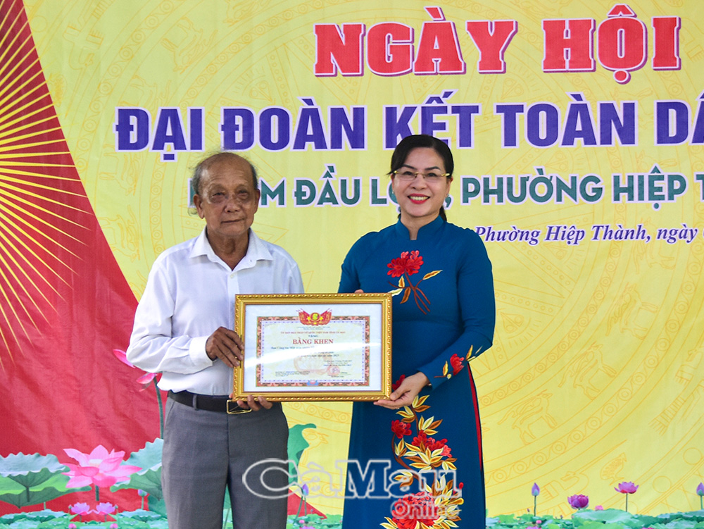 Đồng chí Lê Thị Nhung, Phó Chủ tịch Thường trực HĐND tỉnh, trao khen thưởng của Uỷ ban MTTQ Việt Nam tỉnh Cà Mau cho tập thể Ban Công tác Mặt trận khóm Đầu Lộ A có thành tích xuất sắc trong xây dựng cộng đồng dân cư.