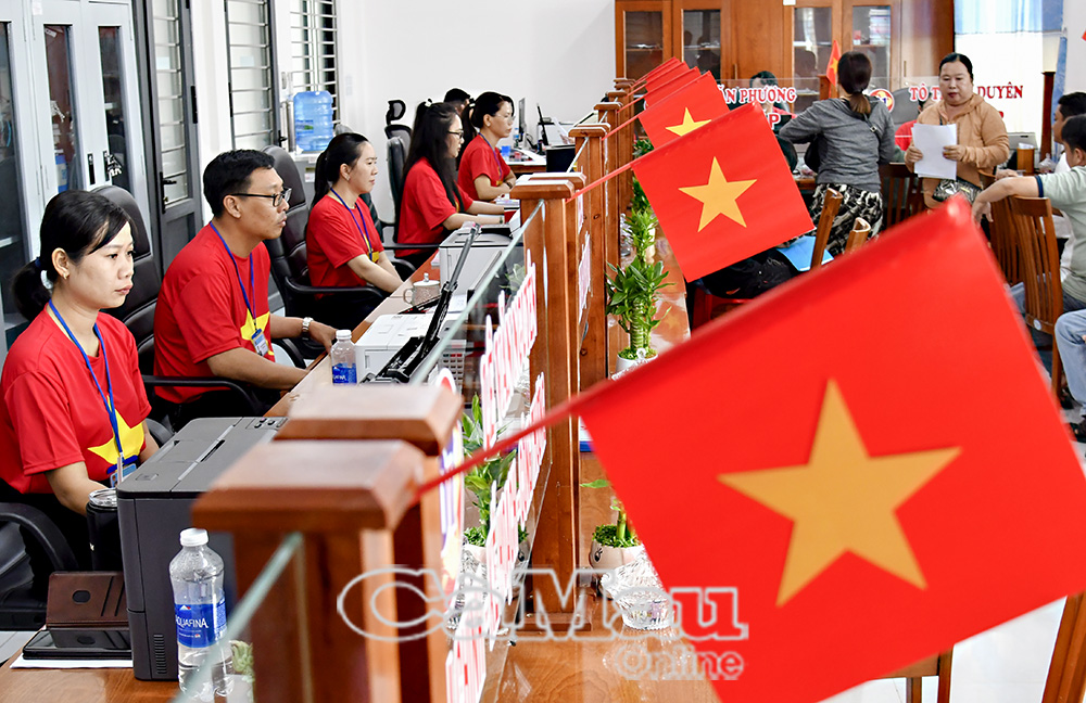 Cán bộ, công chức Trung tâm Phục vụ Hành chính công phường Tân Thành đồng loạt mặc áo đỏ sao vàng, treo cờ Tổ quốc tại bàn làm việc, tạo nên không khí trang nghiêm, lan toả tinh thần yêu nước sâu sắc trong dịp Quốc khánh 2/9.