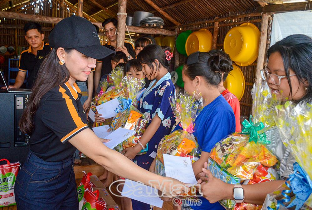 Khách sạn Phú Cường hỗ trợ 38 suất quà, gồm tiền mặt, bánh kẹo, nhu yếu phẩm và áo phao; tổng kinh phí khoảng 25 triệu đồng. Chị Nguyễn Thị Ngọc Mai, Tổng Giám đốc Công ty Cổ phần Thương mại - Dịch vụ - Du lịch Phú Cường, trao quà cho các em.
