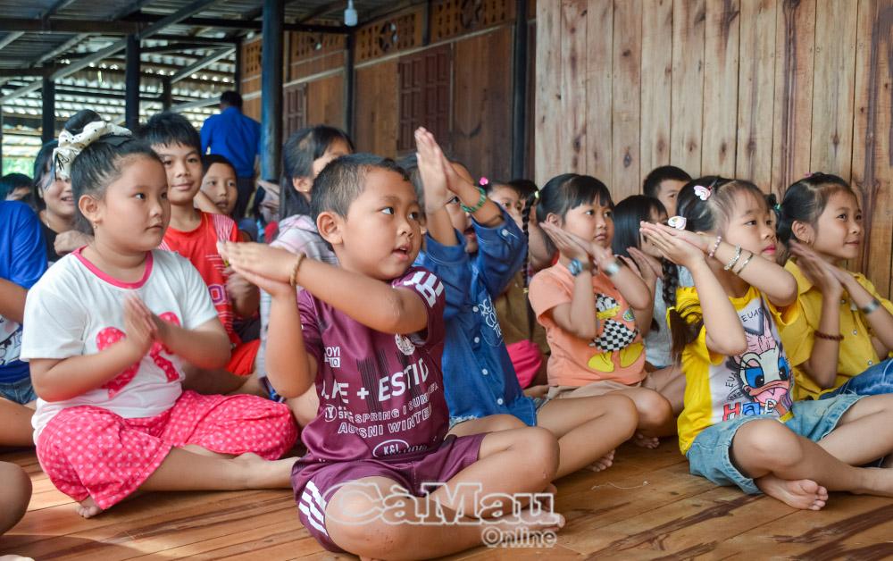 Trong căn nhà sàn, các em nhỏ hào hứng tham gia hoạt động vui chơi.
