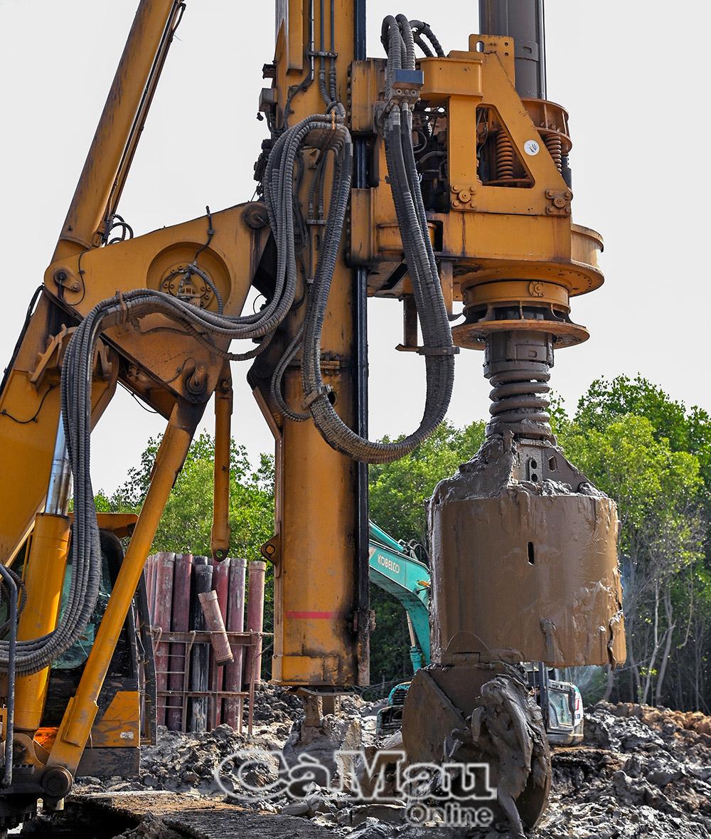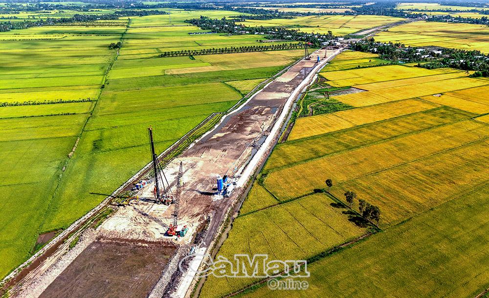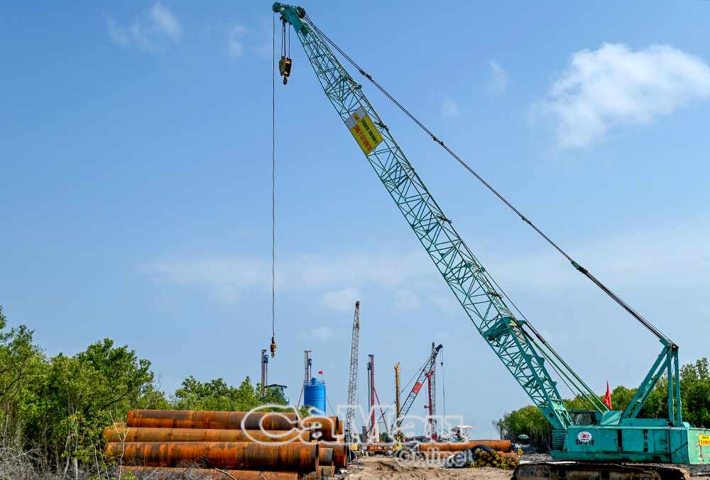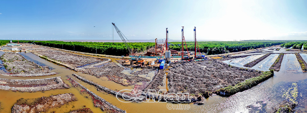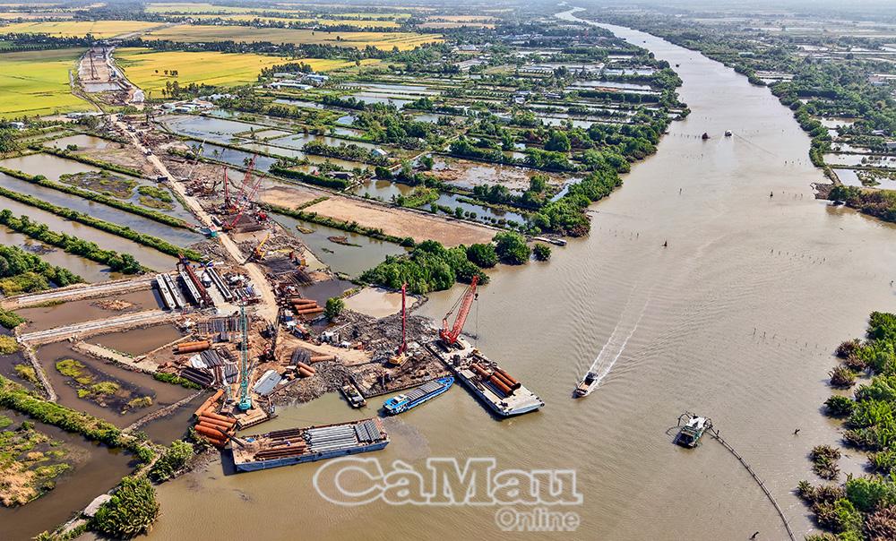 Điểm cuối tuyến cao tốc, đoạn thành phần Cái Nước - Đất Mũi, đồng thời là điểm đầu cầu vượt biển ra đảo Hòn Khoai, đang được đẩy nhanh tiến độ. Khi nguồn vật liệu được bổ sung trong thời gian tới, dự án sẽ tiếp tục tăng tốc, sớm hoàn thiện nền hạ trước mùa mưa.
