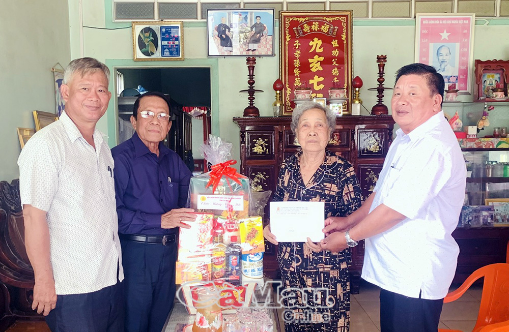 Ông Lê Văn Ngân, Phó Chủ tịch Hội Nạn nhân chất độc da cam/dioxin tỉnh (bên trái) và đồng chí Đoàn Văn Gia, Phó Chủ tịch UBND xã Phước Long, trao quà tết cho các nạn nhân chất độc da cam.