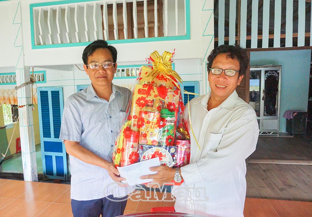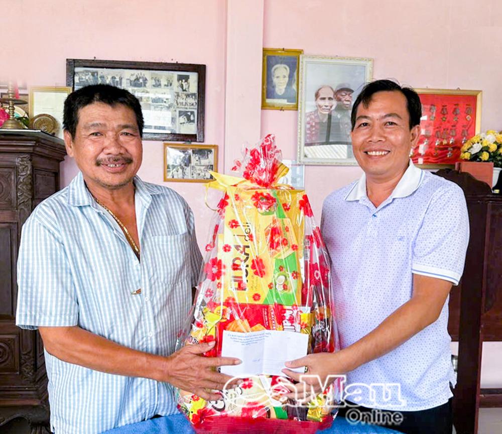 Đồng chí Ngô Minh Toại, Chủ tịch UBND xã Phan Ngọc Hiển tặng quà cho gia đình Anh hùng LLVT Nhân dân Nguyễn Văn Cứng.