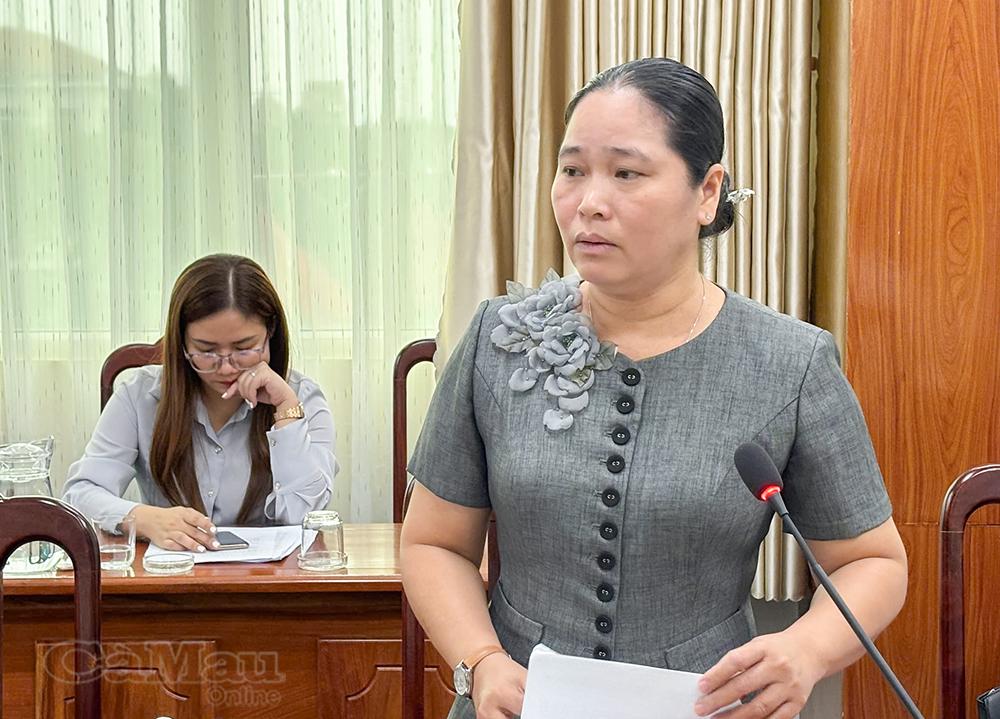 Bà Nguyễn Thu Tư, Giám đốc Sở Dân tộc và Tôn giáo, đóng góp ý kiến vào dự thảo Nghị quyết về phân bổ nguồn vốn sự nghiệp thực hiện Chương trình mục tiêu quốc gia phát triển kinh tế - xã hội vùng đồng bào dân tộc thiểu số và miền núi năm 2025 trên địa bàn tỉnh Cà Mau (sau sắp xếp).