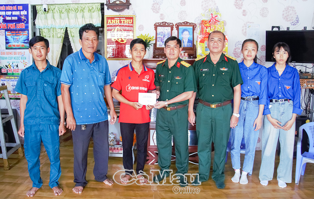 Trung tá Nguyễn Khắc Điệp, Chỉ huy trưởng Ban CHQS Xã Phan Ngọc Hiển cùng Trung uý Nguyễn Văn Giang, Phó Chỉ huy trưởng Ban CHQS Xã Phan Ngọc Hiển trao quà cho thanh niên Trần Quốc Đẳng.