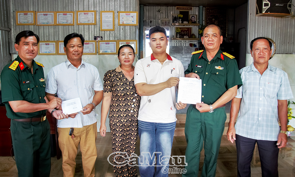 Trung tá Nguyễn Khắc Điệp, Chỉ huy trưởng Ban CHQS Xã Phan Ngọc Hiển (thứ 2, bên phải) cùng Trung uý Nguyễn Văn Giang, Phó Chỉ huy trưởng Ban CHQS Xã Phan Ngọc Hiển trao Quyết định gọi công dân nhập ngũ và quà cho thanh niên Lý Anh Hào.