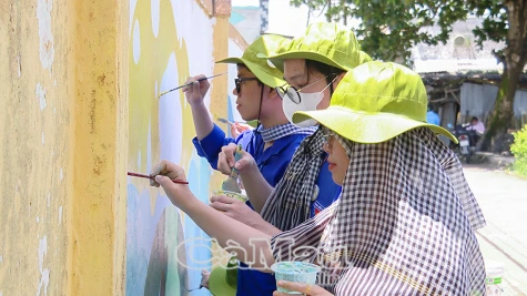 Các chiến sĩ tình nguyện Mùa hè xanh hỗ trợ vẽ tranh tuyên truyền cổ động tại các ấp.