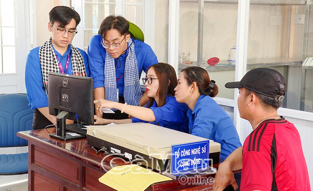 Các chiến sĩ tình nguyện Mùa hè xanh hỗ trợ người dân ứng dụng công nghệ số trong sử dụng dịch vụ công trực tuyến.