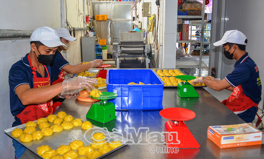 Cơ sở sản xuất bánh, kẹo Huỳnh Minh Thành (phường Bạc Liêu) vào mùa cao điểm sản xuất bánh in, bánh pía, bánh Trung thu.