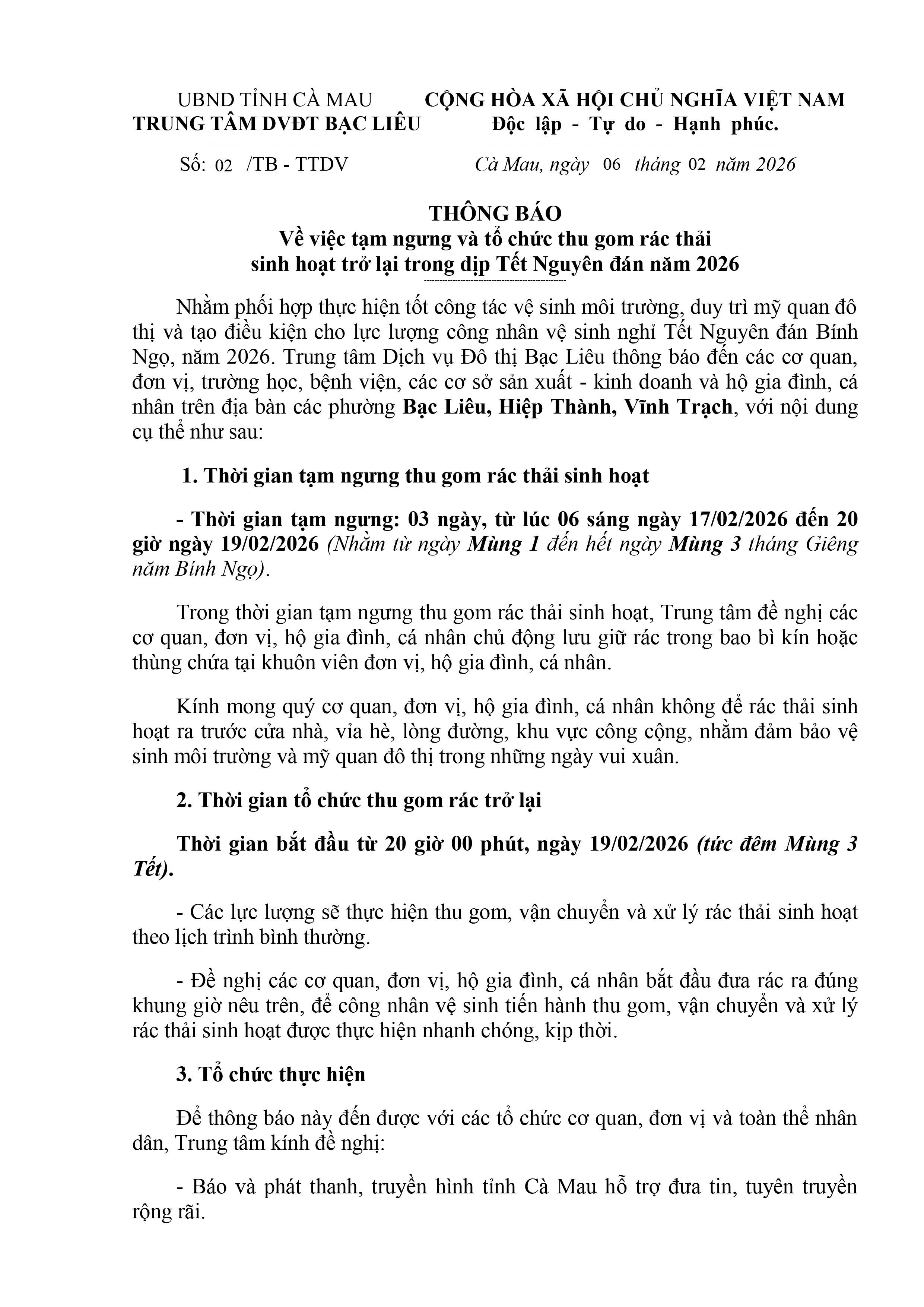 Nhằm phối hợp thực hiện tốt công tác vệ sinh môi trường, duy trì mỹ quan đô thị và tạo điều kiện cho lực lượng công nhân vệ sinh nghỉ Tết Nguyên đán Bính Ngọ, năm 2026. Trung tâm Dịch vụ Đô thị Bạc Liêu thông báo đến các cơ quan, đơn vị, trường học, bệnh viện, các cơ sở sản xuất - kinh doanh và hộ gia đình, cá nhân trên địa bàn các phường Bạc Liêu, Hiệp Thành, Vĩnh Trạch.