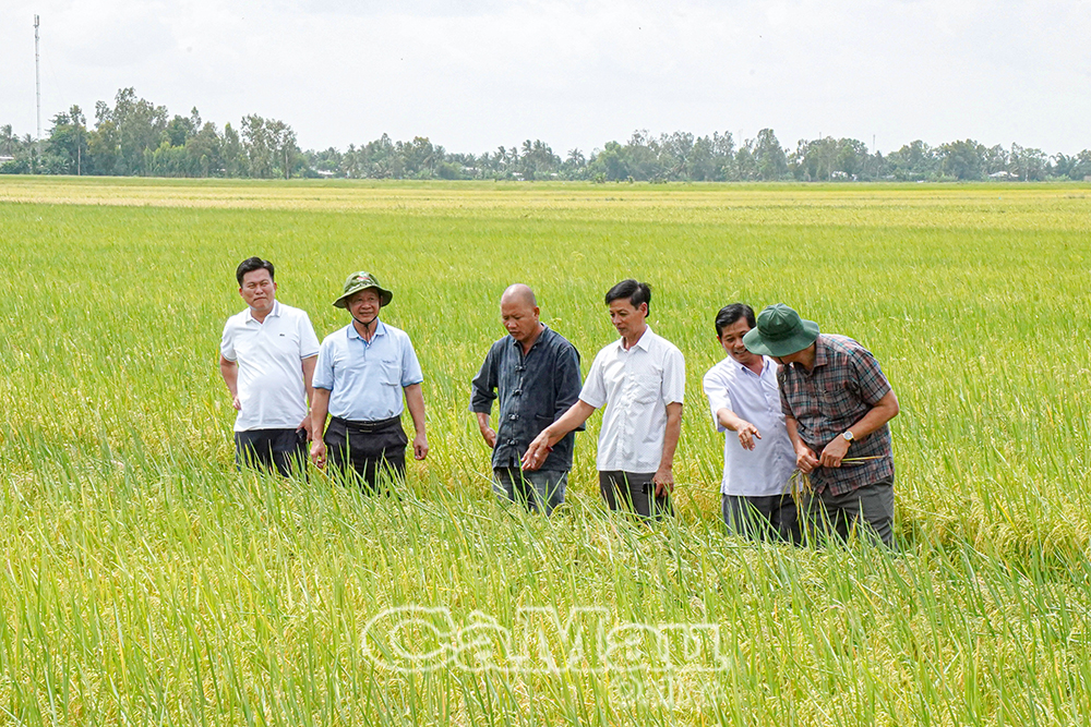 Ông Hồ Trung Việt, Trưởng Ban Tuyên giáo và Dân vận Tỉnh uỷ Cà Mau (thứ 2, bên trái), tìm hiểu mô hình lúa hữu cơ tại phường Láng Tròn.