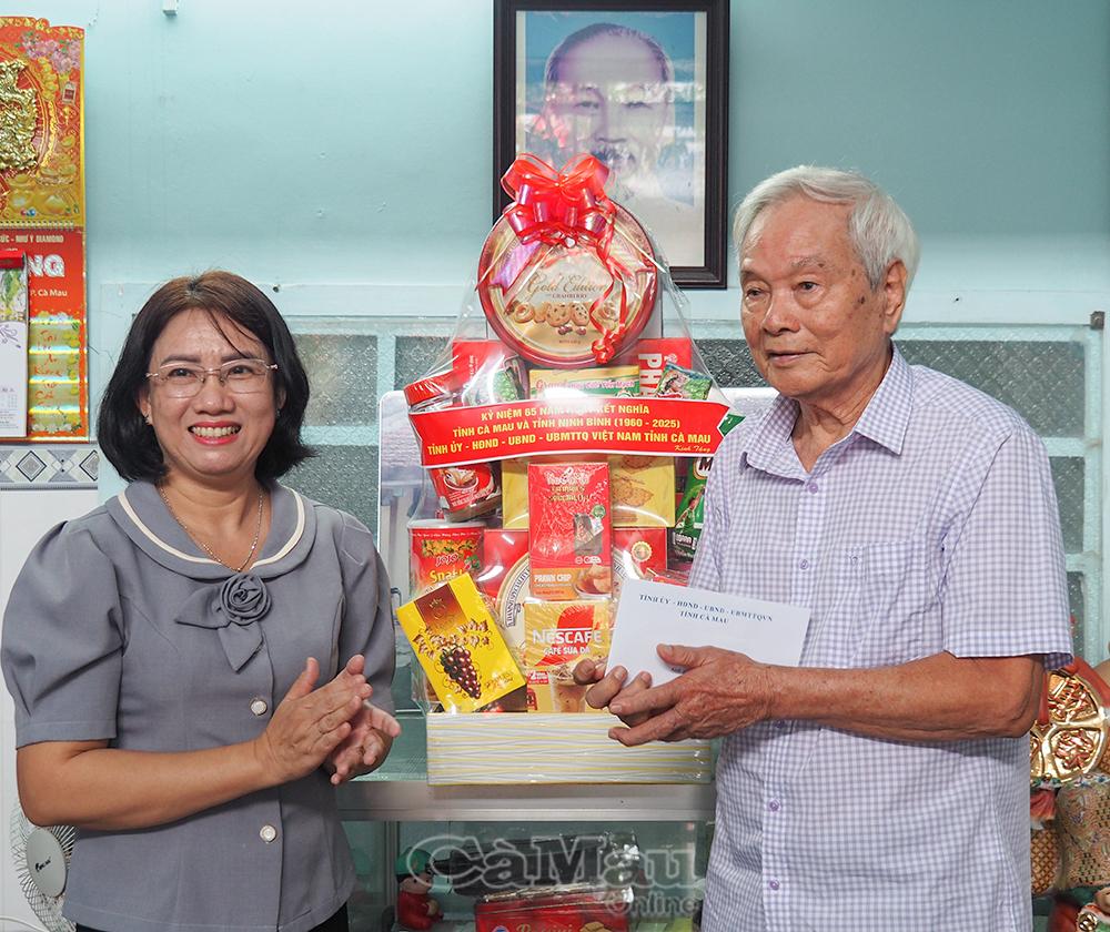 Phó Giám đốc Sở Nội vụ Nguyễn Thuỳ Như tặng quà tri ân ông Bùi Hải Dâng, cán bộ hưu trí.
