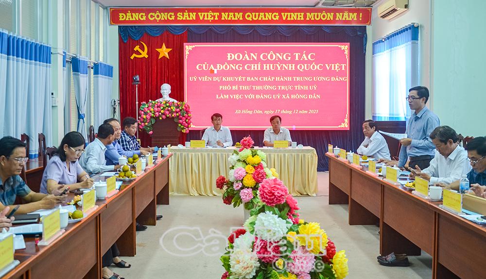 Đó là chỉ đạo của đồng chí Huỳnh Quốc Việt, Uỷ viên Dự khuyết Ban Chấp hành Trung ương Đảng, Phó Bí thư Thường trực Tỉnh uỷ, tại buổi làm việc với Đảng uỷ xã Hồng Dân vào sáng 17/12. Cùng tham gia đoàn có đại diện lãnh đạo các sở, ngành tỉnh.