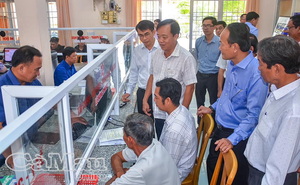 Trước đó, Phó Bí thư Thường trực Tỉnh uỷ Huỳnh Quốc Việt cùng đoàn công tác đã đến thăm, tìm hiểu các mô hình sản xuất, kinh doanh hiệu quả trên địa bàn xã Hồng Dân; kiểm tra tình hình hoạt động của Trung tâm Phục vụ hành chính công xã. (Trong ảnh: Đồng chí Huỳnh Quốc Việt gặp gỡ, thăm hỏi người dân đến giao dịch tại Trung tâm Phục vụ hành chính công xã).