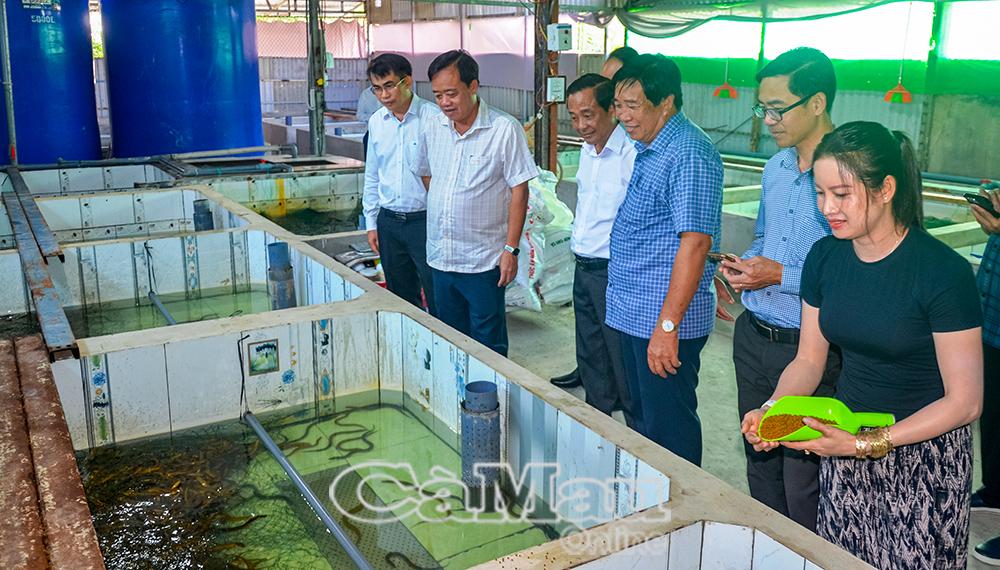 Đồng chí Huỳnh Quốc Việt cùng đoàn công tác tham quan mô hình nuôi lươn tại ấp Nội Ô.