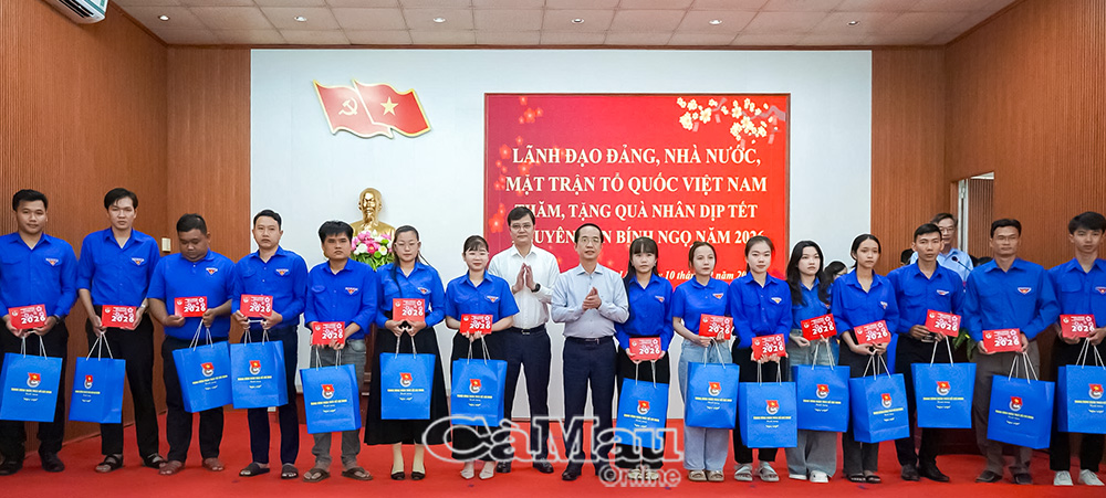 Đồng chí Bùi Quang Huy, Bí thư Thứ nhất Trung ương Đoàn Thanh niên Cộng sản Hồ Chí Minh (bên trái) cùng đồng chí Hồ Thanh Thuỷ, Phó Bí thư Tỉnh uỷ, Chủ tịch Uỷ ban MTTQ Việt Nam tỉnh Cà Mau, trao quà cho đoàn viên, thanh niên tiêu biểu.