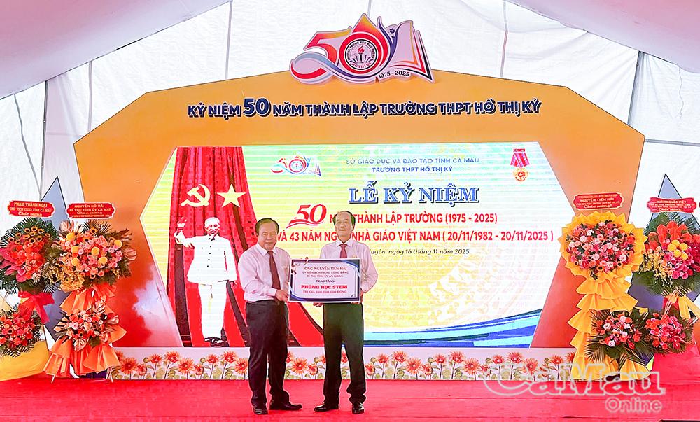 Đồng chí Nguyễn Minh Luân, Uỷ viên BTV Tỉnh uỷ, Phó Chủ tịch UBND tỉnh, trao biểu trưng quà của đồng chí Nguyễn Tiến Hải, Uỷ viên Ban Chấp hành Trung ương Đảng, Bí thư Tỉnh uỷ An Giang, cựu học sinh của Trường THPT Hồ Thị Kỷ tặng nhà trường một Phòng học STEM hiện đại.