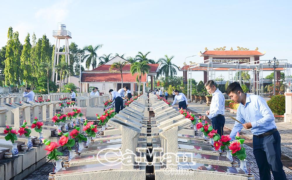Cán bộ, đảng viên, đoàn viên thắp hương trên từng mộ phần để tưởng nhớ vong linh các anh hùng liệt sĩ tại Nghĩa trang Liệt sĩ tỉnh.