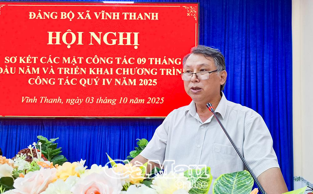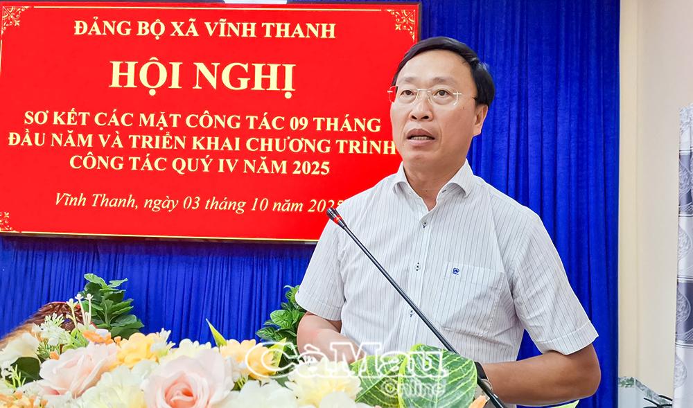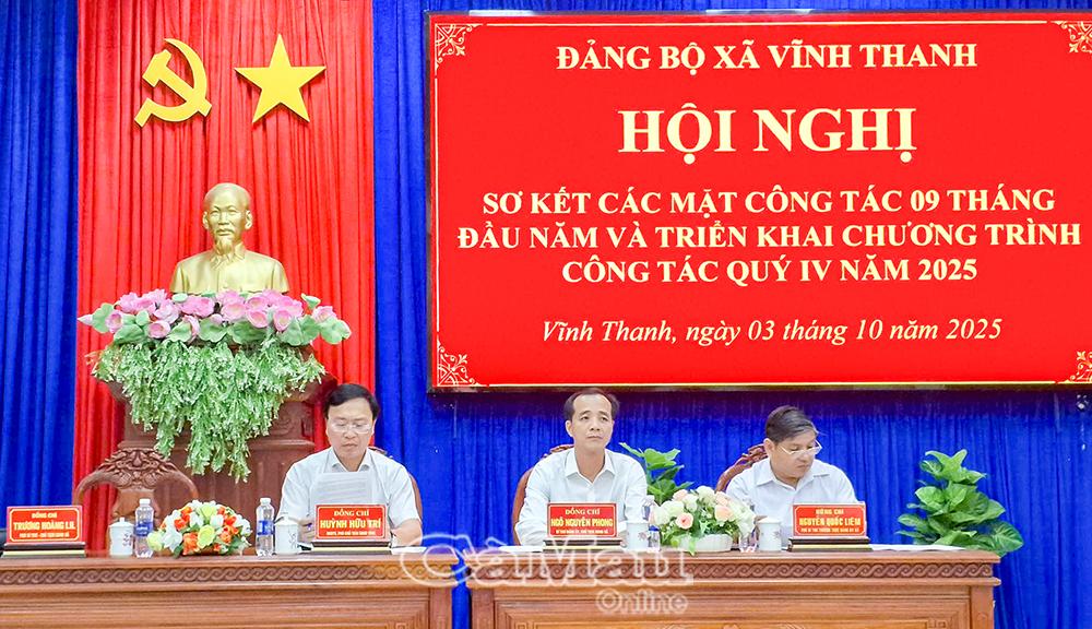 Ngày 3/10, Đảng uỷ xã Vĩnh Thanh tổ chức Hội nghị sơ kết 9 tháng đầu năm, triển khai nhiệm vụ quý IV/2025. Phó Chủ tịch UBND tỉnh Huỳnh Hữu Trí dự và phát biểu chỉ đạo tại hội nghị.