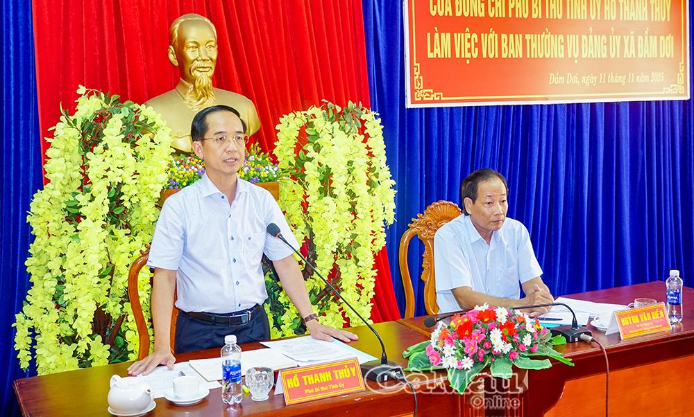 Kết thúc buổi làm việc, đồng chí Hồ Thanh Thuỷ khẳng định, Tỉnh uỷ sẽ tiếp tục quan tâm, chỉ đạo, tạo điều kiện để xã Đầm Dơi phát huy lợi thế, hoàn thành tốt các mục tiêu giai đoạn tới, góp phần thực hiện thắng lợi Nghị quyết Đại hội Đảng bộ tỉnh.