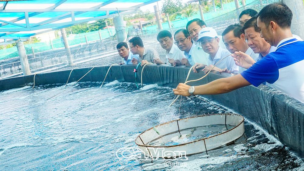 Đồng chí Hồ Thanh Thuỷ, Phó Bí thư Tỉnh uỷ (thứ 4, từ phải sang), tham quan mô hình nuôi tôm siêu thâm canh tại ấp Tân Hiệp, xã Đầm Dơi.