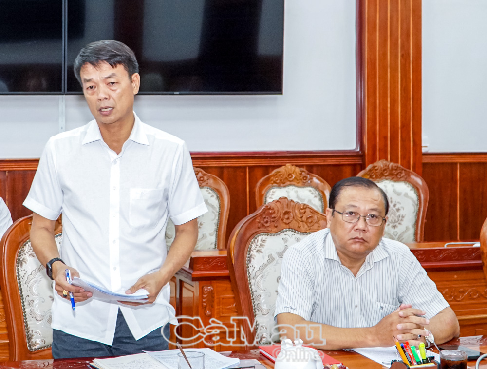 Đồng chí Ngô Minh Toàn, Phó Tổng biên tập Báo và Phát thanh, Truyền hình Cà Mau, báo cáo tình hình hoạt động của đơn vị tại buổi làm việc.