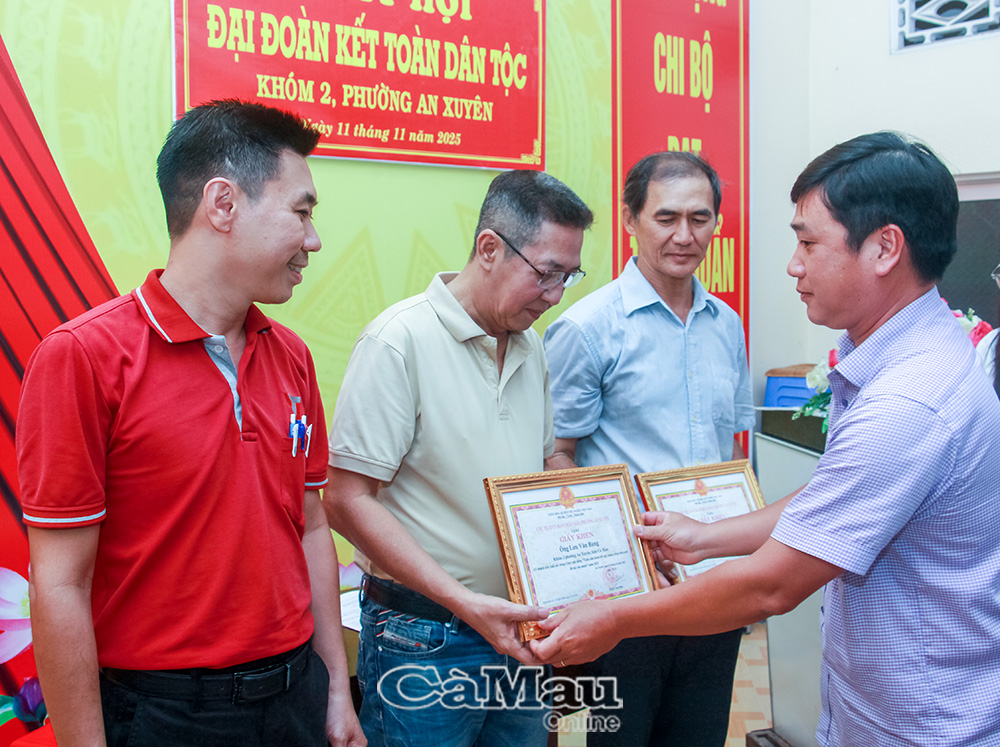 Phó Chủ tịch UBND phường An Xuyên trao giấy khen của Chủ tịch UBND phường cho các cá nhân của Khóm 2 về thành tích trong công tác Mặt trận năm 2025.