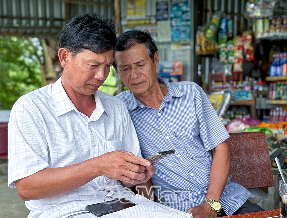 Đồng chí Nguyễn Văn Điểm, Phó Bí thư Chi bộ, Trưởng Ban công tác Mặt trận Ấp 1, xã Phong Thạnh (bên trái), ứng dụng công nghệ thông tin vào hoạt động tập hợp, vận động Nhân dân.