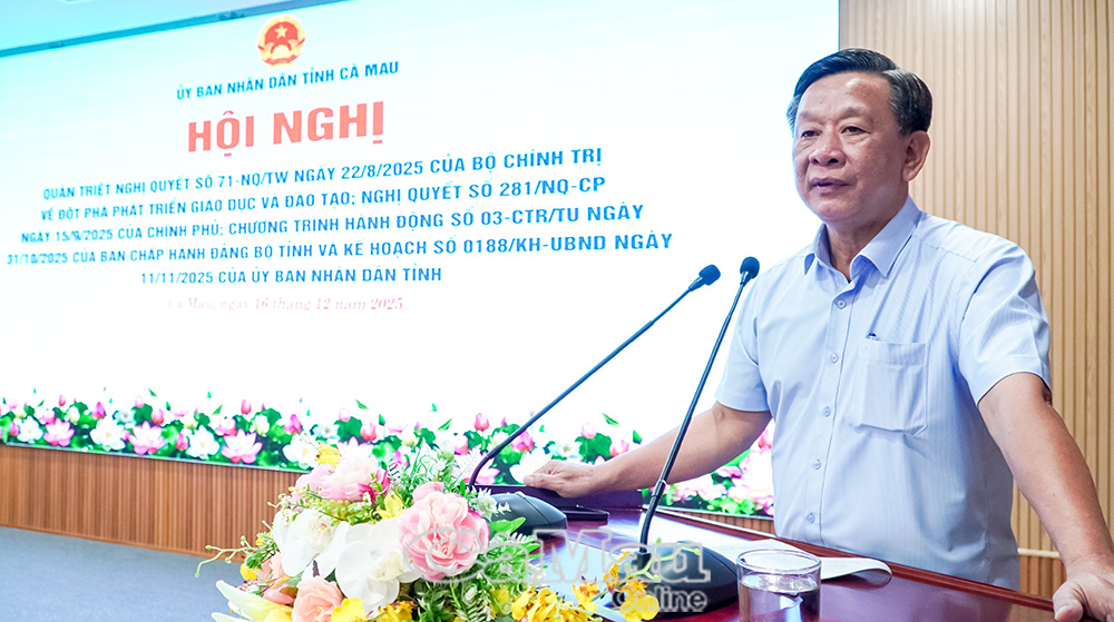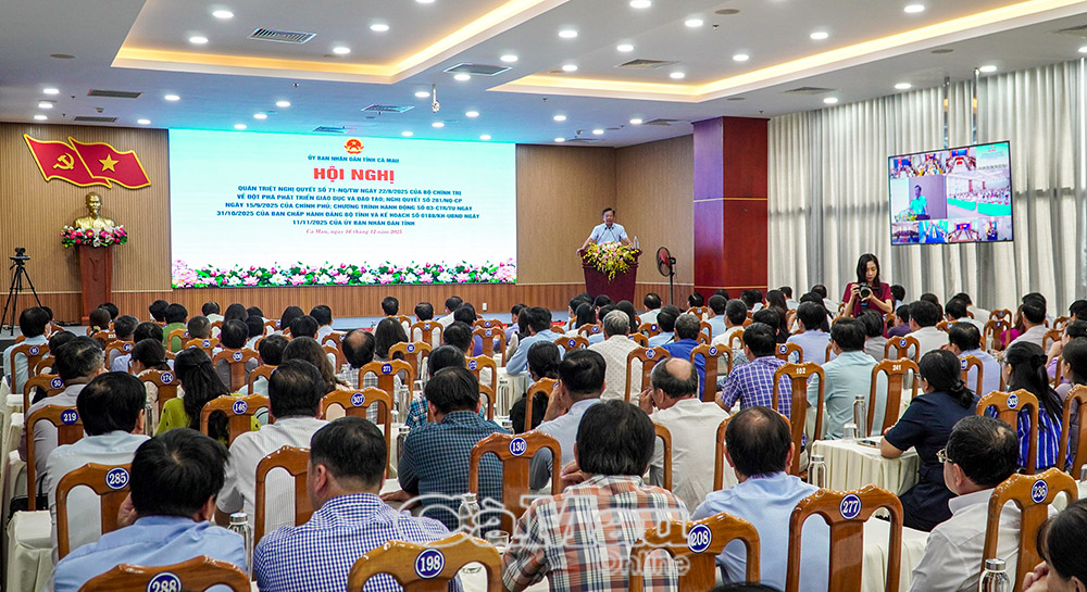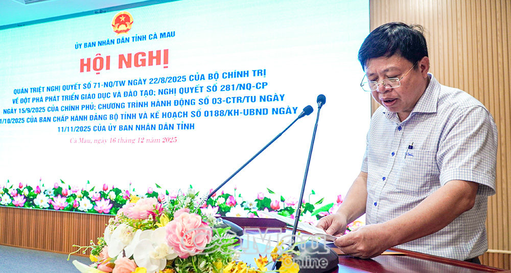Sáng 16/12, UBND tỉnh Cà Mau tổ chức Hội nghị triển khai, quán triệt Nghị quyết số 71-NQ/TW ngày 22/8/2025 của Bộ Chính trị về đột phá phát triển giáo dục và đào tạo; Nghị quyết số 281 của Chính phủ; Chương trình hành động số 03 của Tỉnh uỷ và Kế hoạch số 0188 ngày 11/11/2025 của UBND tỉnh về thực hiện Nghị quyết số 281 của Chính phủ và Chương trình 03 của Tỉnh uỷ.