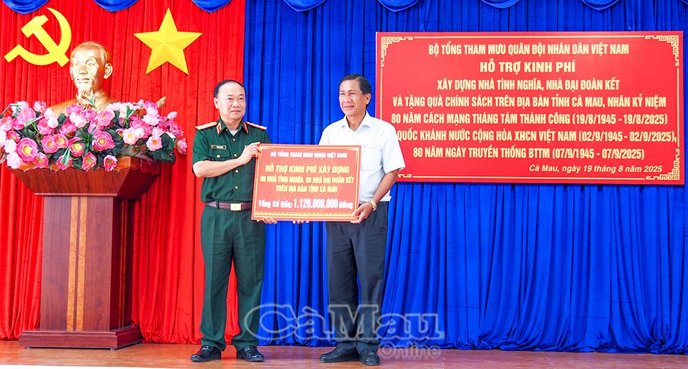 Nhân dịp này, đoàn công tác Bộ Tổng Tham mưu đã trao tặng 16 căn Nhà tình nghĩa, Nhà đại đoàn kết cùng 80 suất quà cho các gia đình có công với cách mạng và hộ dân có hoàn cảnh khó khăn, với tổng trị giá trên 1,1 tỷ đồng. Bộ Tư lệnh Quân khu 9 cũng trao tặng 33 phần quà cho bà con.