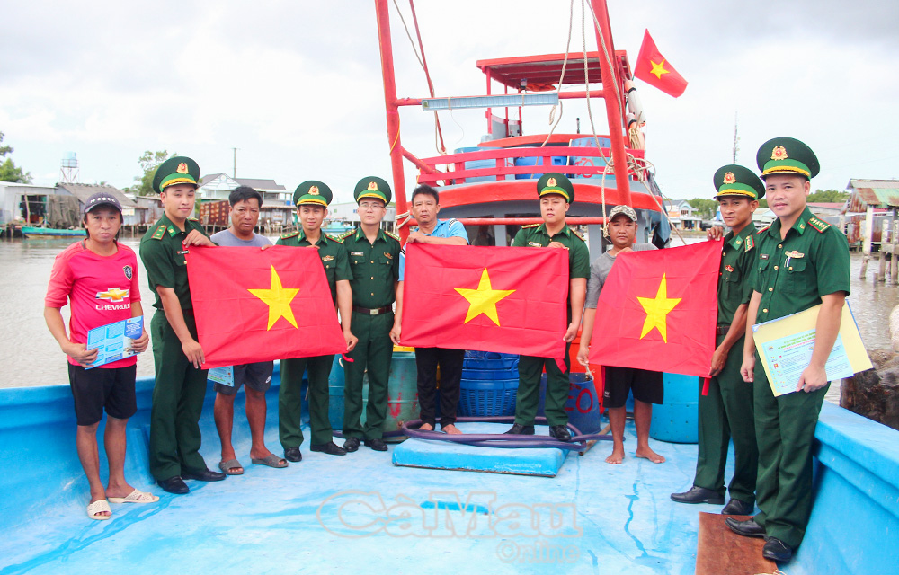 Cán bộ Bộ đội Biên phòng tỉnh Cà Mau tuyên truyền, tặng cờ Tổ quốc cho các ngư dân, qua đó góp phần phát triển ngành, nghề khai thác thủy sản theo hướng bền vững.