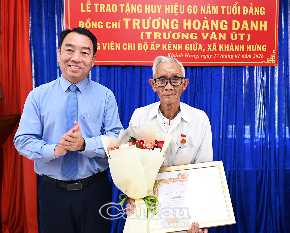 Tại xã Khánh Hưng, Chủ tịch UBND tỉnh Lữ Quang Ngời trân trọng trao Huy hiệu 60 năm tuổi Đảng cho đảng viên Trương Hoàng Danh, hiện sinh hoạt tại Chi bộ ấp Kênh Giữa.