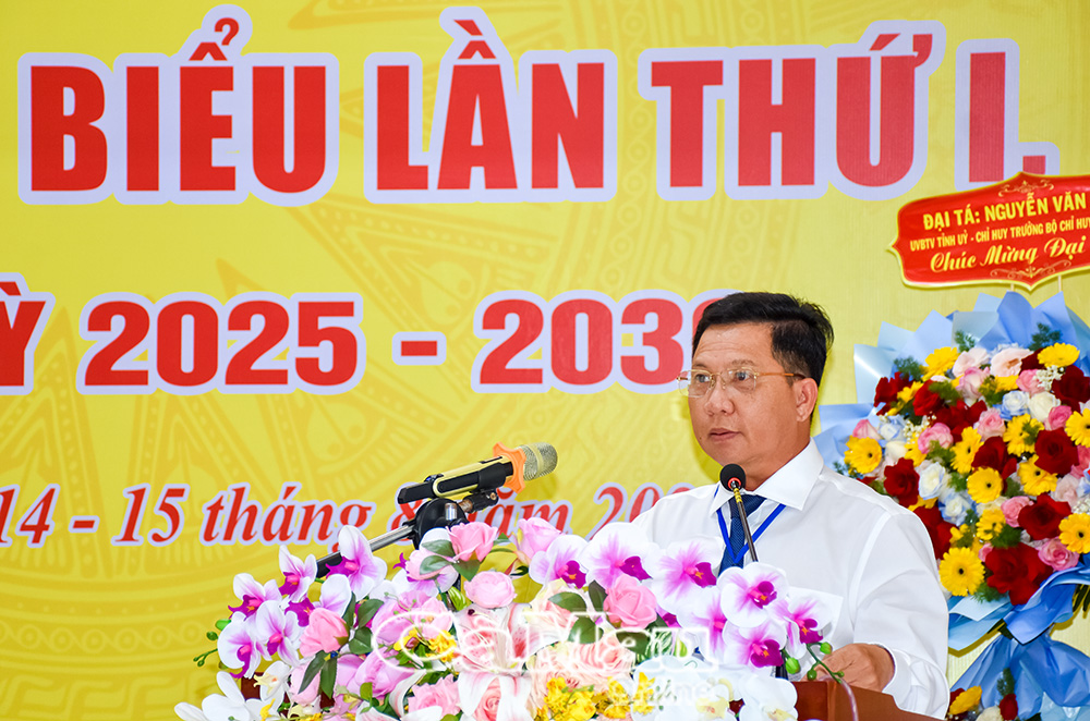 Đại tá Nguyễn Văn Hùng, Uỷ viên Ban Thường vụ Tỉnh uỷ, Chỉ huy trưởng Bộ Chỉ huy Quân sự tỉnh Cà Mau, phát biểu tại đại hội.
