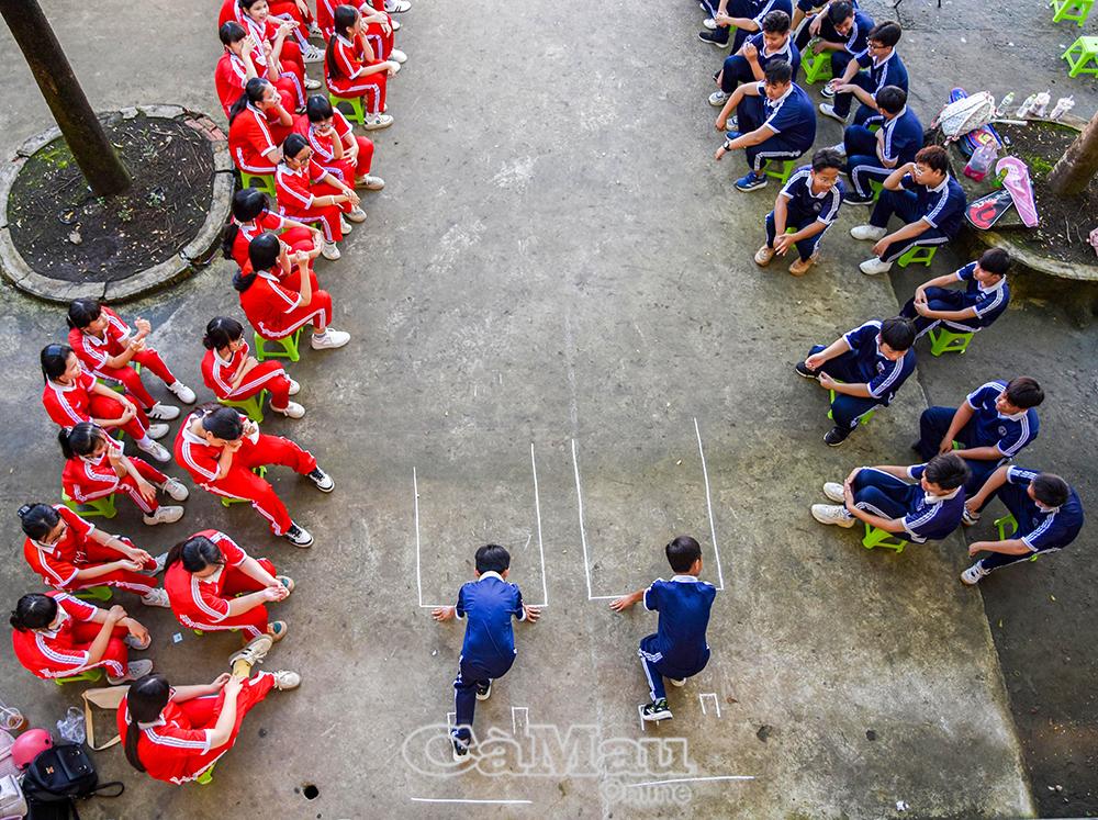 Học sinh trường THPT Hồ Thị Kỷ học môn thể dục ngay tại sân trường.